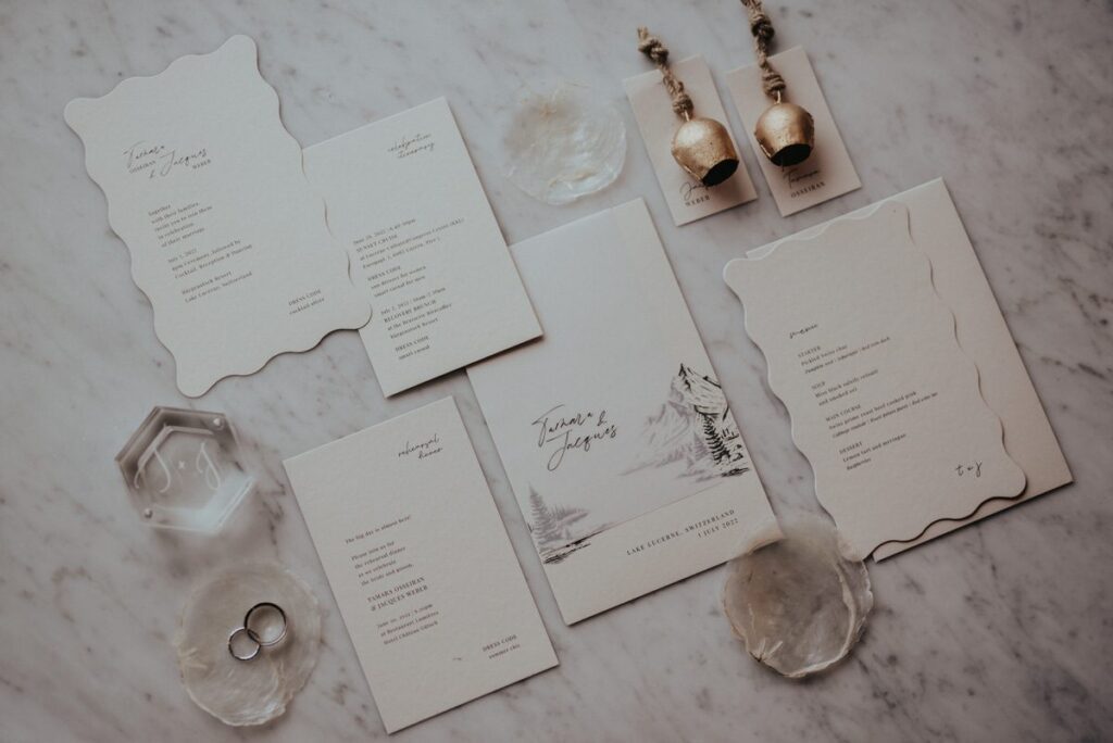 Die Papeterie wurde, wie auch die gesamte Hochzeitsdekoration, elegant und schlicht gehalten. Passend zur Hochzeitslocation wurden die Schweizer Berge von dem Unternehmen Cute and Paste Lab auf die Einladungen gezeichnet. Dieses Flatlay wurde von Kuenzli Photography aufgenommen.