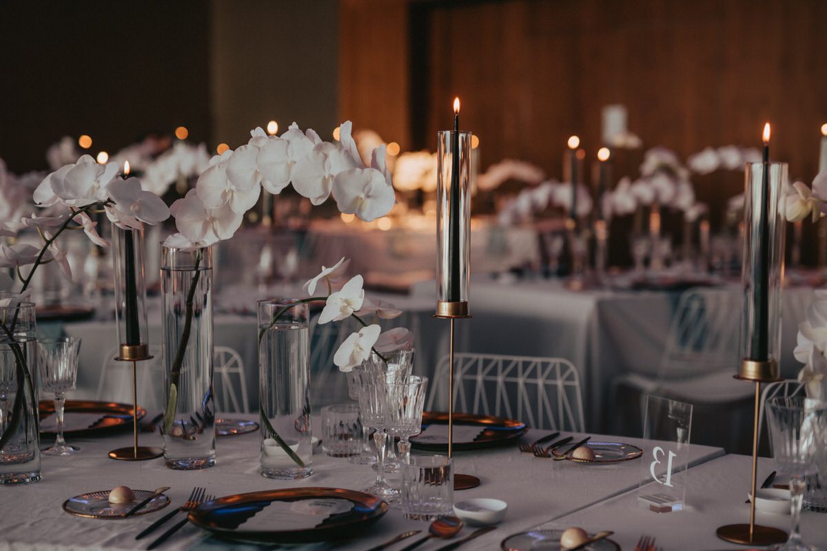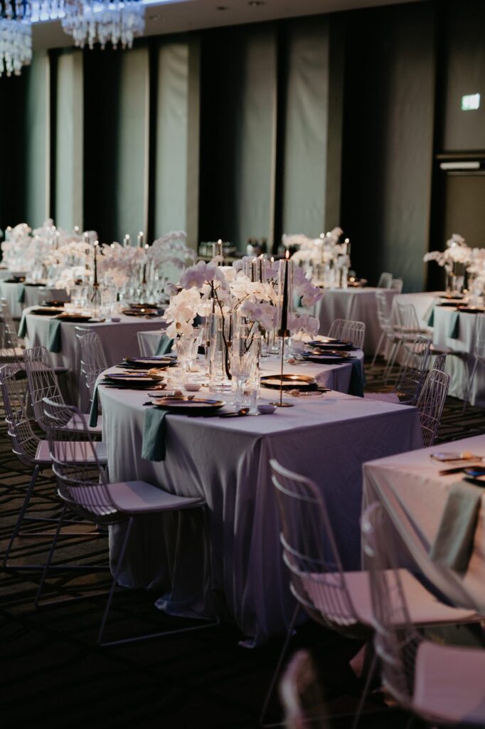 Die Tischdekoration wurde elegant und schick gehalten. Es wurden unsere bodenlangen Leinentischdecken in Off-White/Milchweiß verwendet, die nicht so hart wirken wie die üblichen weißen Polyestertischdecken. Die Tischdecke ist somit die perfekte Basis für eine schöne Hochzeitsdekoration. Für diese Hochzeit im Bürgenstock Resort wurden die Farben Weiß, Schwarz und Gold aufgegriffen. Die filigranen mattgoldenen Kerzenständer wurden als eleganter Akzent mit schwarzen Stabkerzen eingesetzt. Zudem vervollständigten unser elegantes schwarz-goldenes Besteck, ein passender Speiseteller und ein goldener Brotteller die Tischdekoration.