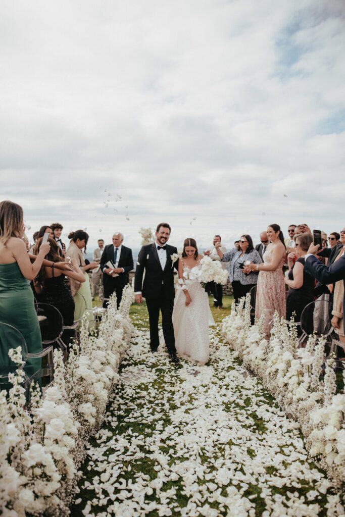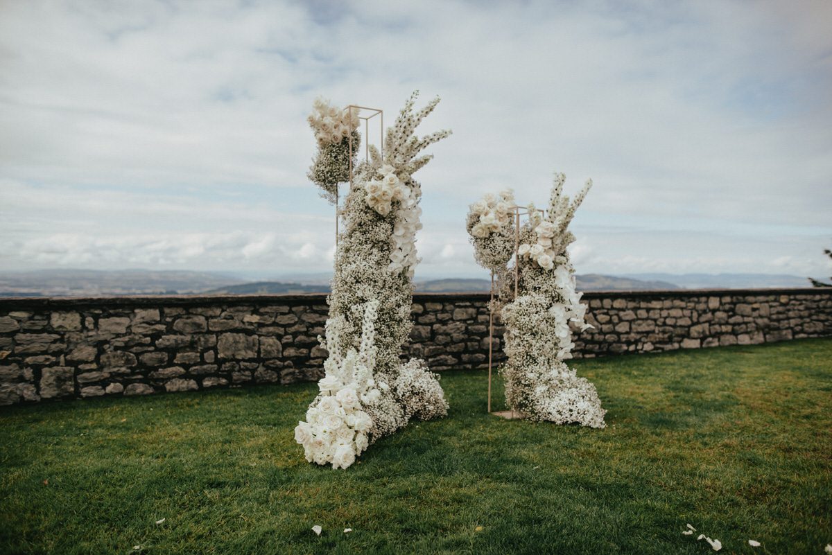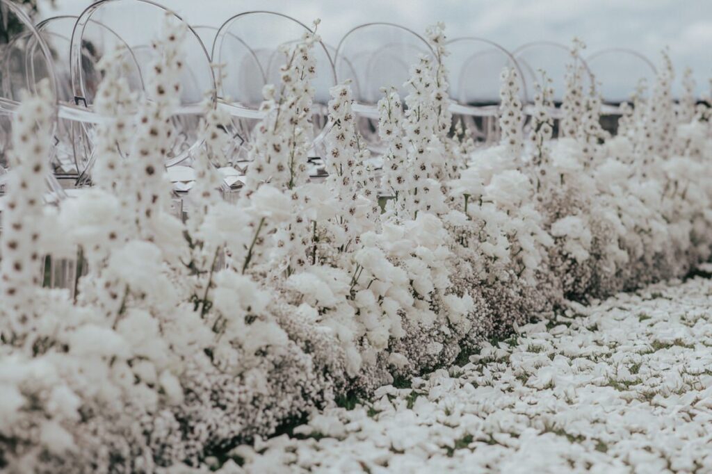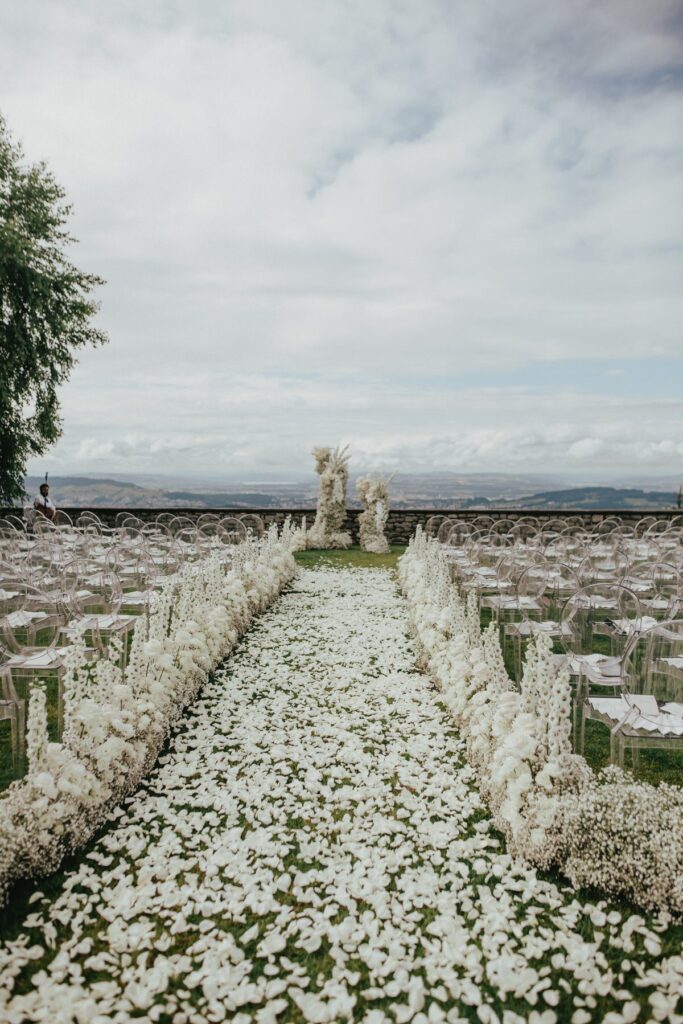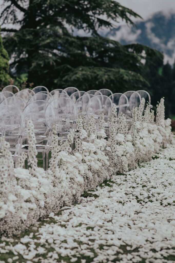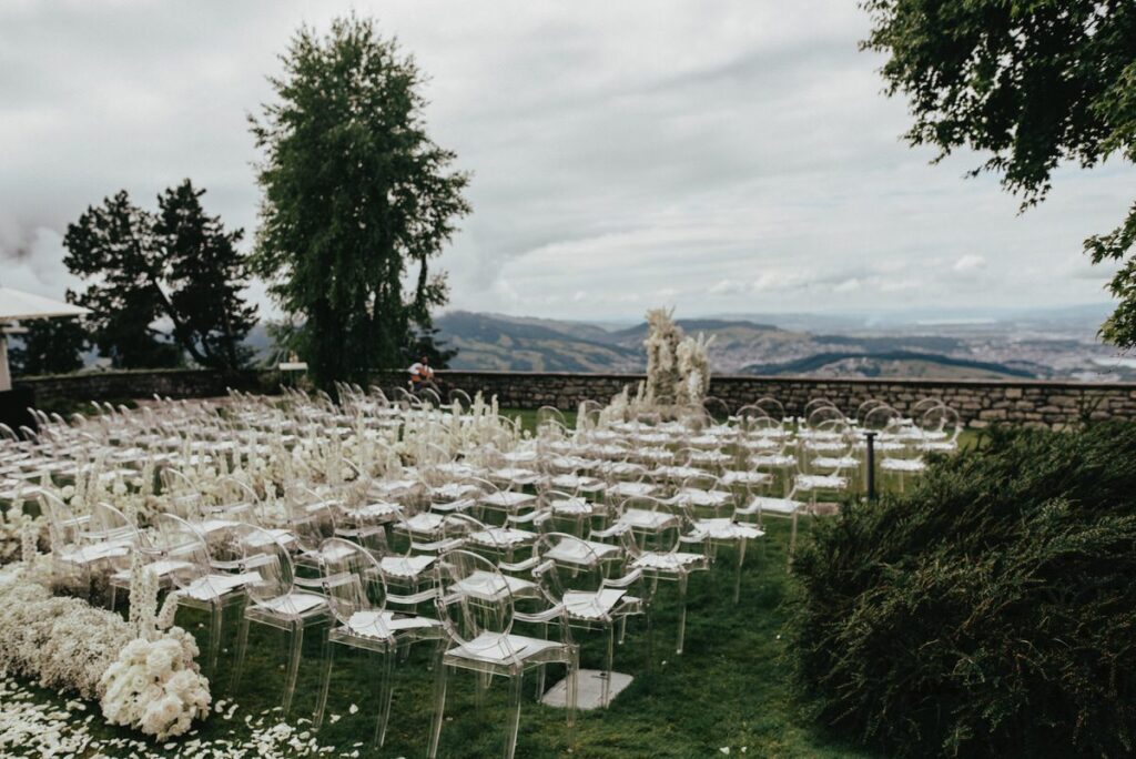In einem weißen Blütenmeer konnten die Frischvermählten gemeinsam durch den Traugang schreiten. MyAwina hat sich bei der Hochzeitsfloristik mit einem speziellen „Traubogen” und eleganten Blumenarrangements entlang des Hochzeitsganges selbst übertroffen. Die Blumen und unsere schicken Ghost Chairs setzten den Spa-Garten im wunderschönen Bürgenstock Resort perfekt in Szene.