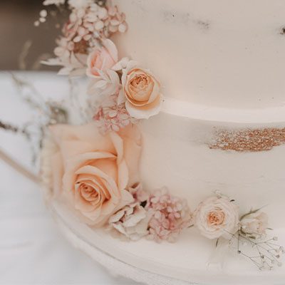 Die Hochzeitstorte nimmt wiederum die naturverbundenen Farben auf, besticht allerdings auch durch ihre Eleganz. Den dreistöckigen Semi Naked Cake zauberte Jasmina von Naschwerk & Co. Seit 10 Jahren zaubert sie besondere Tortenkreationen und geht dabei ihrer persönlichen Berufung nach. Die gebürtige Kroatin arbeitete ursprünglich als Juristin, hatte sich jedoch für die Kreativität entschieden. So gab es neben der Hochzeitstorte auch viele kleine Naschereien. An der Candybar blieben von Macarons, Donuts, Cupcakes bis Cakepops keine Wünsche offen.