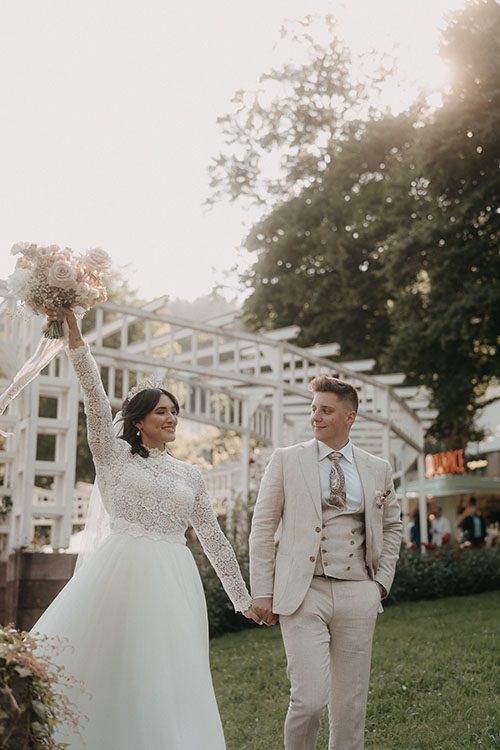 Katharina Damm und ihr Leo gaben sich im Kurpark von Bad Wildbad das Ja-Wort. Mit kirchlicher Trauung und einer bezaubernden Feier in einer alten Keramikwerkstatt zauberte Svenja Fischer eine Traumhochzeit für die Influencerin und ihren Mann.