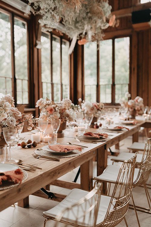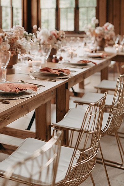 Gefeiert wurde an einer ganz besonderen Location. Bei einem Spaziergang entdeckten sie diese Keramikwerkstatt. Ohne ein eingespieltes Team vor Ort, ließ diese Location jede Menge Gestaltungsmöglichkeiten. Gelegen im Kurpark von Bad Wildbad gab es viel zu organisieren, da auch Dienstleister und Helfer von außerhalb kamen. Neben unsere Lucy Wire Stühlen gibt es auf dieser Tafel zahlreiche weitere Leihartikel aus unserem Shop zu bestaunen. So ergänzen unsere Musselinservietten in der Farbe Terracotta die florale Dekoration. Dabei schmiegen sie sich in das Bild der langen Tafel mit unseren massiven Holztischen.