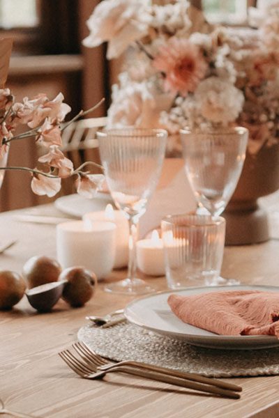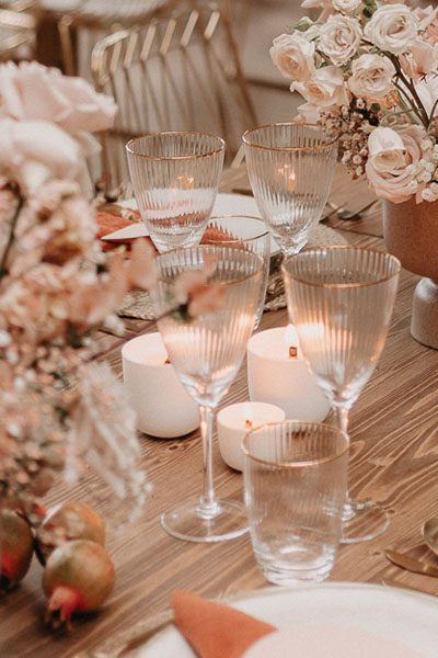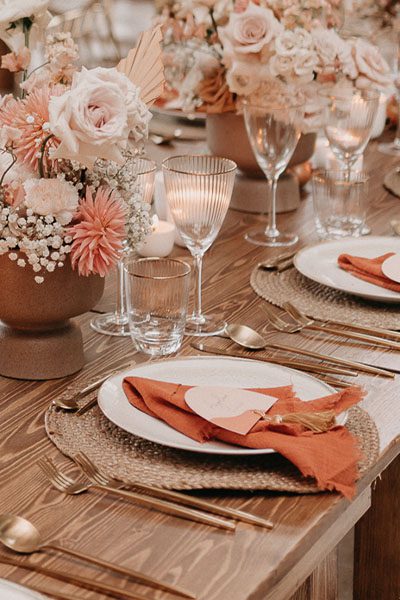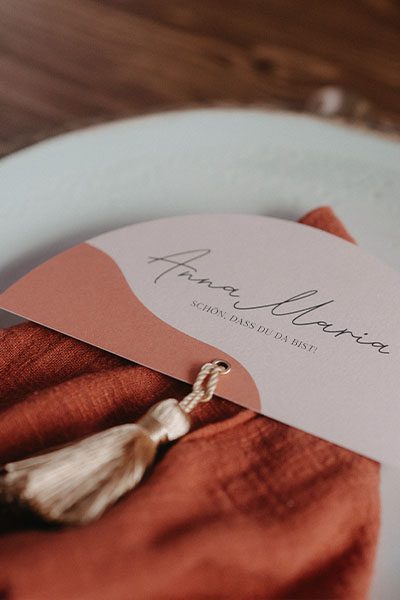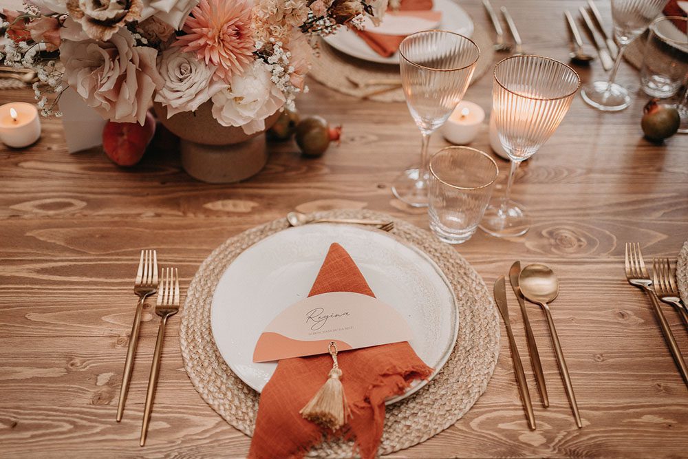 Die terracotta-Töne in dem ehemaligen Keramikatelier wirken nicht nur elegant, sondern auch naturverbunden. Dieser Eindruck wird verstärkt durch die ausleihbaren Platzsets aus Jute. Ergänzt wird die Eleganz durch unsere Leiharen Weingläser mit Goldrand. Durch die besondere Struktur brechen sie das Licht besonders schön und wirken durch ihren goldenen Rand besonders edel. Ein weiterer goldener Akzent wird durch das goldene Besteck gesetzt. Modern und edel passen sie perfekt zu unseren ausleihbaren goldenen Lucy Wire Stühlen. Die farblich abgestimmten Namensschilder stammen von der Kartenmacherei. Diese stellte die gesamte Hochzeitspapeterie der Influencer Hochzeit.