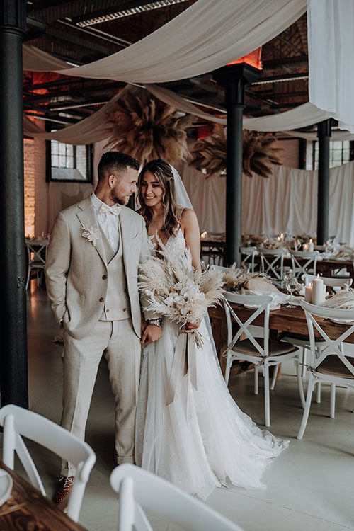 Mit dem Bloom Flower Studio aus Lüneburg haben Pia und Matt genau die richtige Floristik für ihr eigenes Konzept ausgewählt. Der Brautstrauß sowie die gesamte Floristik ist geprägt von jede Menge Pampasgras und gedeckten beige und weiß Tönen. Wild, natürlich und dennoch elegant machen den Stil der Floristik sowie der Hochzeit aus. Die gesamte Blumendekoration bestand aus haltbaren Blumen und Trockenblumen.