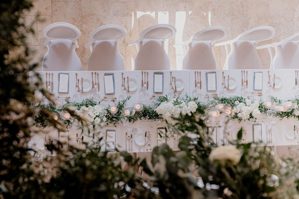 Die zarte Offwhite-Farbe der Tischdecken fügt sich harmonisch in das königliche Ambiente des Schlosses ein und schaffte eine warme und einladende Atmosphäre für das festliche Dinner. Das sanfte Weiß des Leinens verleiht den Tischen eine subtile Leichtigkeit und bildet die perfekte Grundlage für die restliche Tischdekoration.