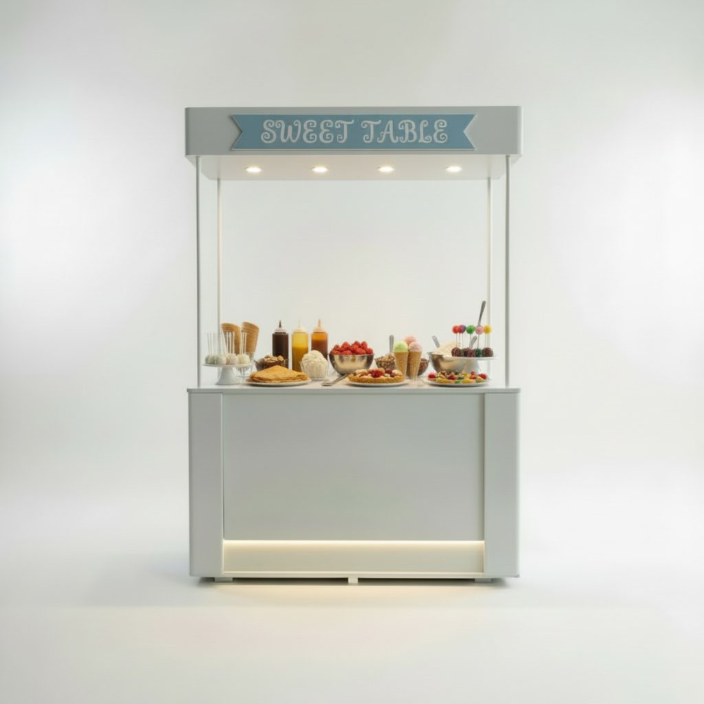 Dank der angenehmen Höhe und dem durchdachten Aufbau lässt er sich mühelos aufbauen, dekorieren und nutzen – auch mit wenig Personal. Wenn Sie nach einem charmanten Möbelstück suchen, das Funktionalität und Ästhetik vereint, ist dieser Stand genau das Richtige.