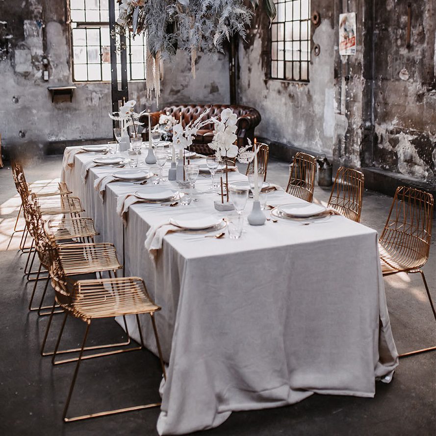 Die gesamte Kollektion ist aus dem gleichen Metall in einem edlen Gold gefertigt und sieht besonders in Kombination der einzelnen Bestandteile der Lucy Wire Kollektion immer atemberaubend aus. Kombiniert passt sie perfekt auf eine Hochzeit mit langen Tafeln oder Bankettbestuhlung, die um einen schicken Barbereich erweitert wird. Die Lucy Wire Bar Stools können in Vierergruppen gepaart einen Lucy Wire Table umrahmen und sorgen für angeregte Unterhaltungen, die durch die Komfortabilität der Stühle lange fortgeführt werden können. Wer eher nach roségold sucht, findet diese Stühle nun auch mit Metallstreben in dieser Farbe.