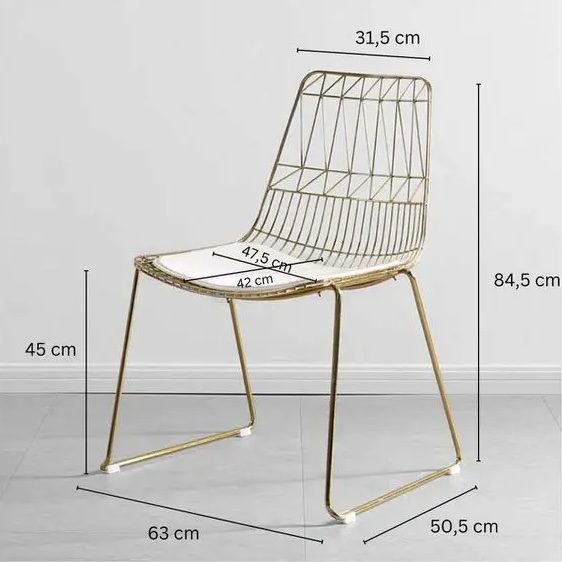 Die goldenen Metallstreben laufen auf der Sitzfläche vertikal die Lehne hoch, bis in das untere Drittel der Lehne des Lucy Wire Stühle. Die oberen beiden Drittel der Stuhllehne sind durch ein elegantes Zick-Zack-Muster verschönert, das nochmal in zwei schmalere Bereiche mit einem breiten Bereich in der Mitte aufgeteilt ist. Die Stuhlbeine der zu mietenden Lucy Wire Stühle sind in in einer dreieckigen Form gehalten, die oben leicht geöffnet bleibt und nach unten leicht ausgestellt zuläuft.