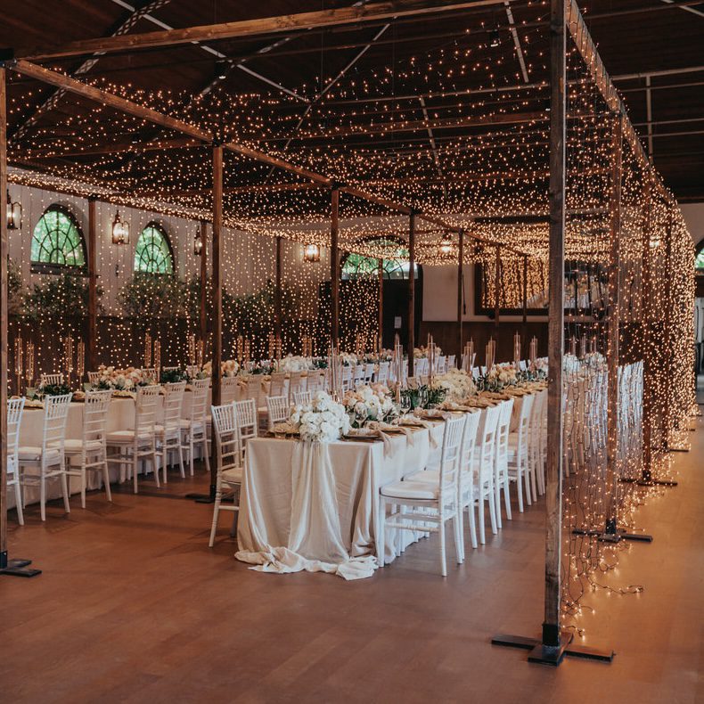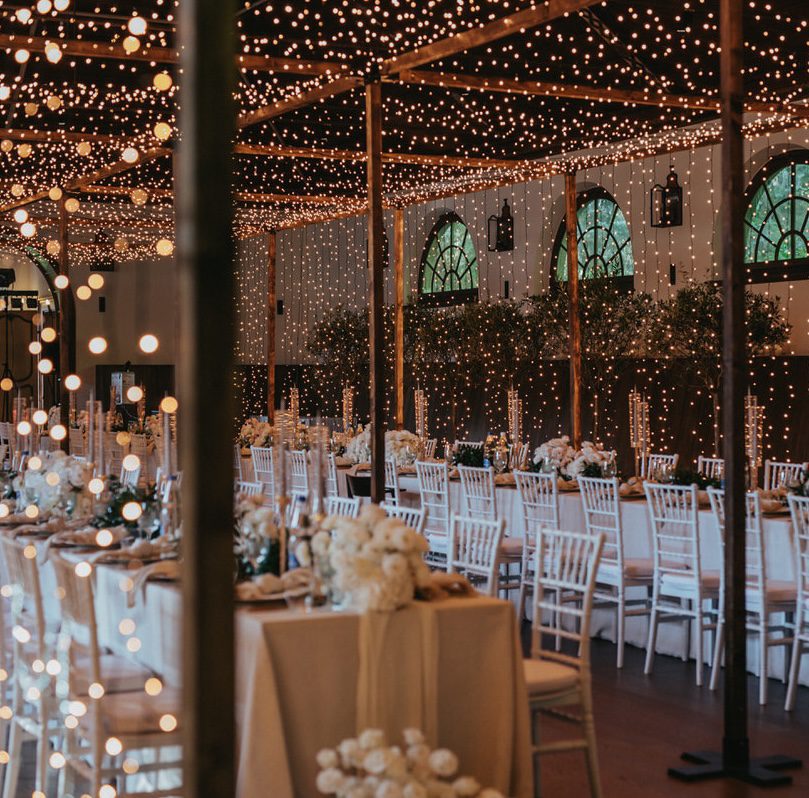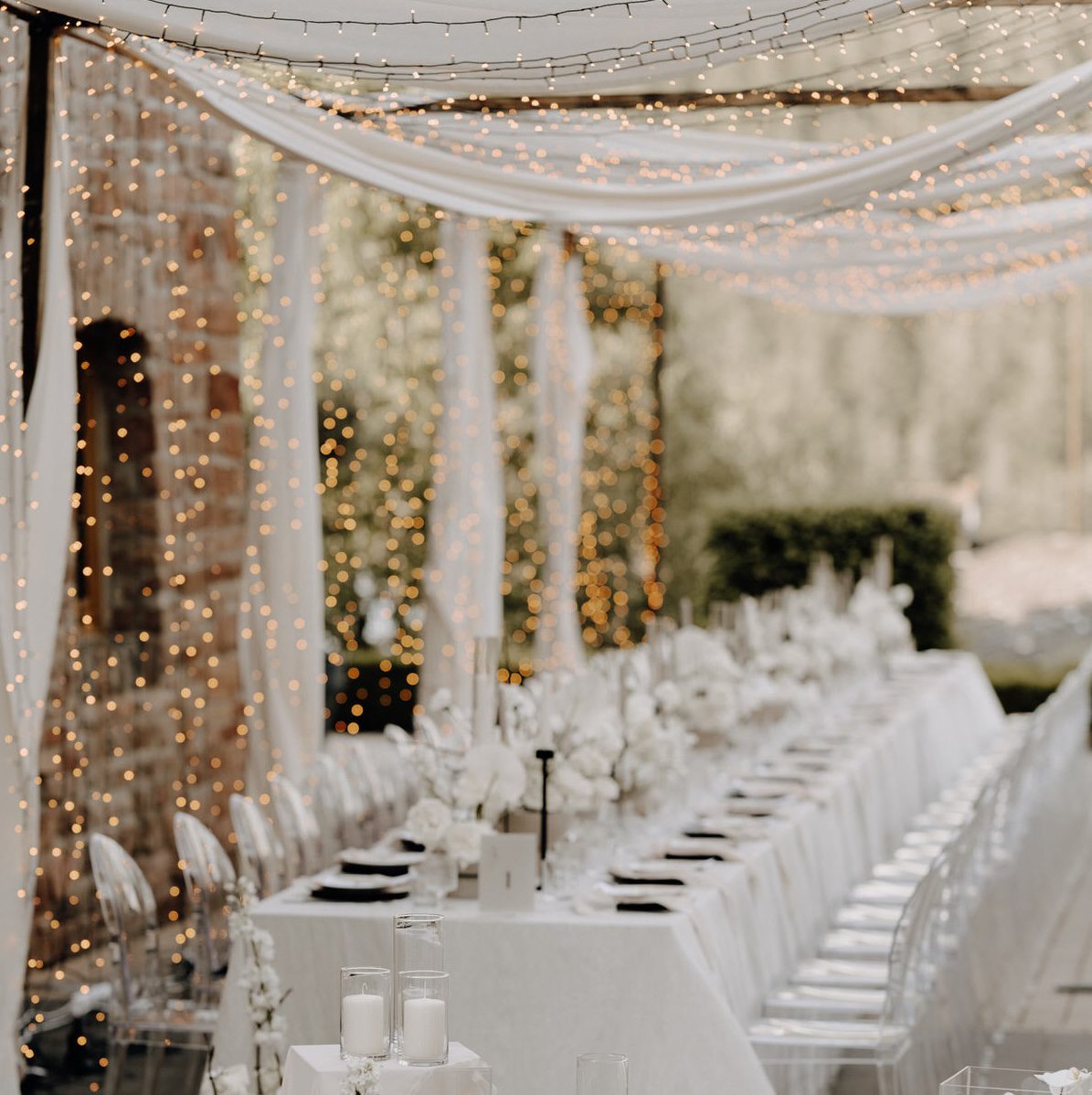 - Der klassische Lichtertunnel: Bestücken Sie das Gerüst mit hunderten LED-Lichtpunkten für ein magisches Dinner unter dem “Sternenhimmel”.