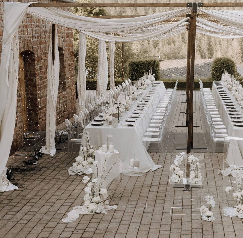 Im Gegensatz zu festen Pavillons bietet der Dinner Frame maximale Flexibilität. Dank des durchdachten Steck- und Schraubsystems lassen sich die Segmente nahtlos aneinanderreihen. So entsteht ein beeindruckender Tunnel-Effekt über die gesamte Länge Ihrer Festtafel – egal ob 6, 12 oder 30 Meter.