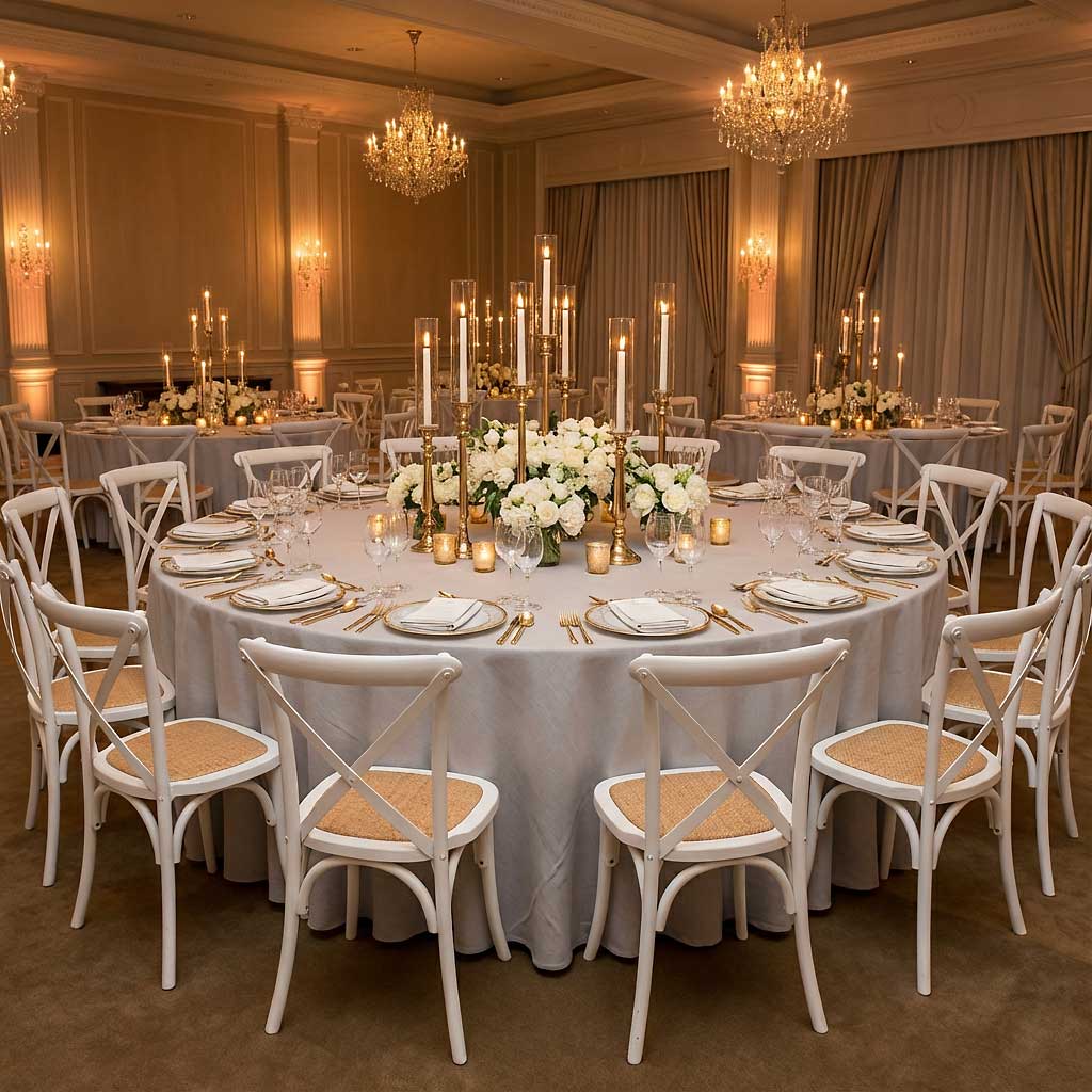 Rundes Banketttisch-Ensemble zur Miete – stilvoll feiern mit Komfort