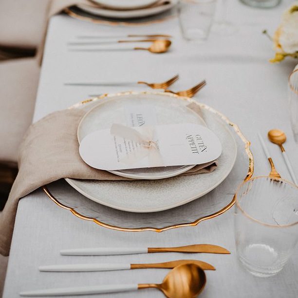 Miete die verzierten Glasplatzteller mit Goldrand und bring Glanz auf deinen Tisch – für ein durchdachtes, elegantes Gesamtbild, das bei deinen Gästen garantiert Eindruck hinterlässt.