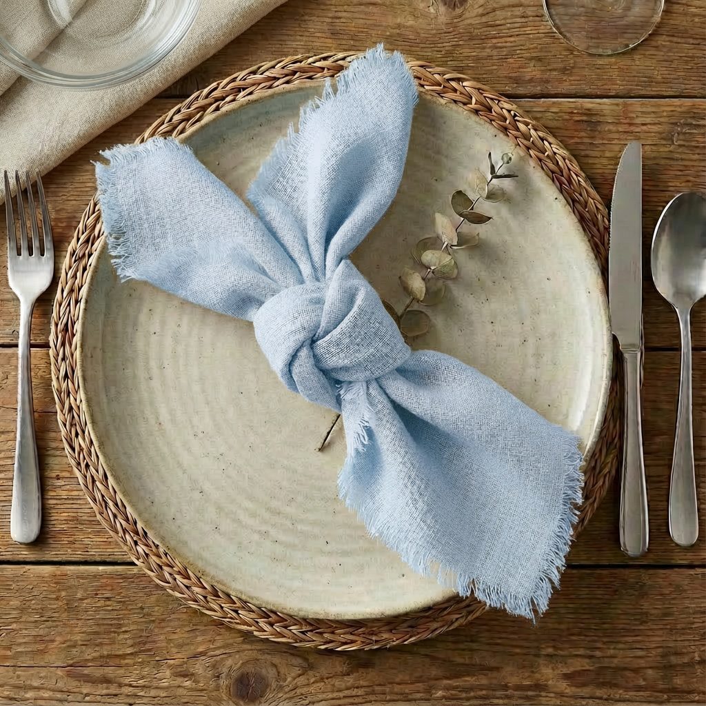 Musselinservietten in Eisblau zum Mieten – Stilvolle Tischdekoration für jedes Event