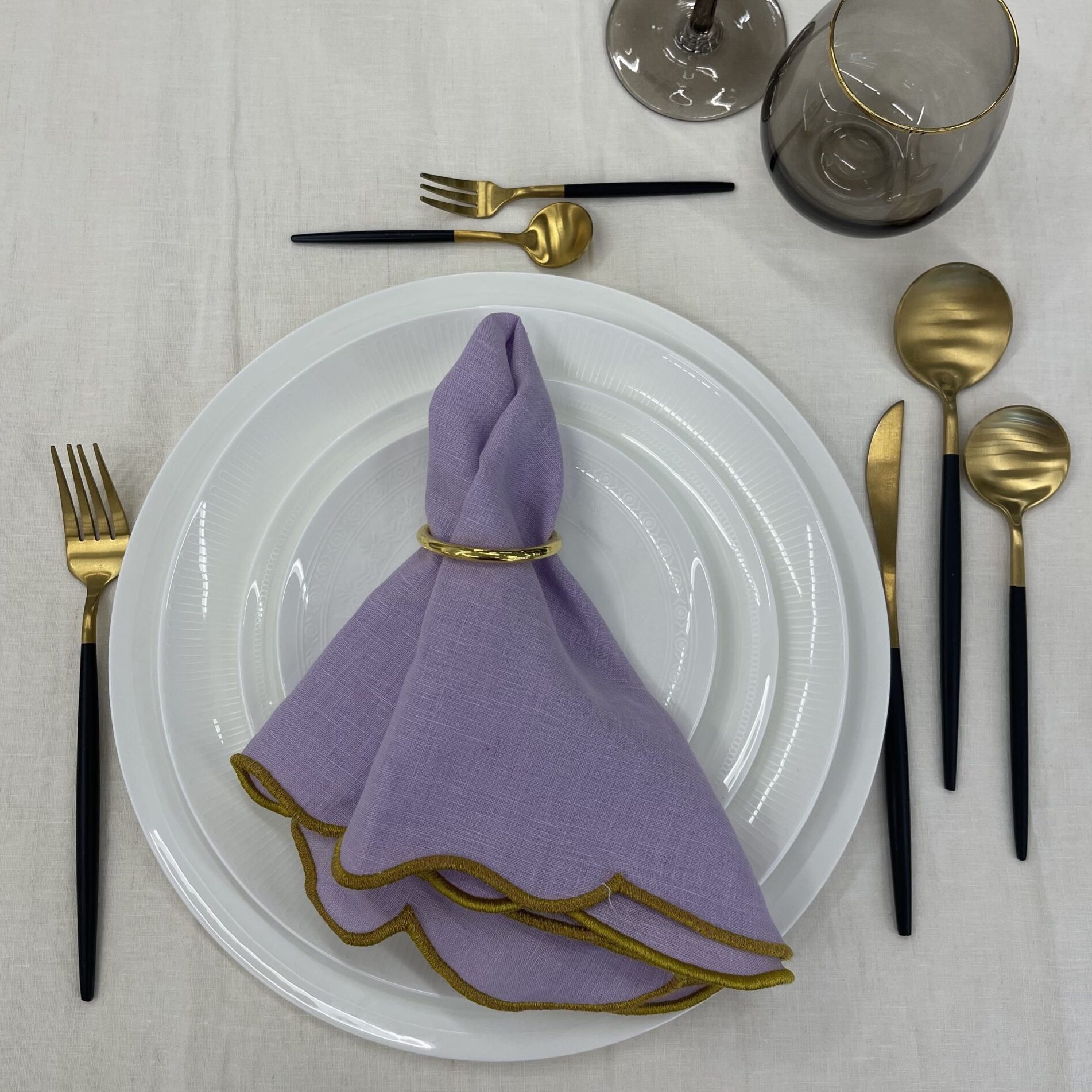 Miete jetzt die Leinenservietten Scalloped in Flieder und verleihe deinem Event eine elegante, farbenfrohe Note, die deine Gäste begeistern wird!