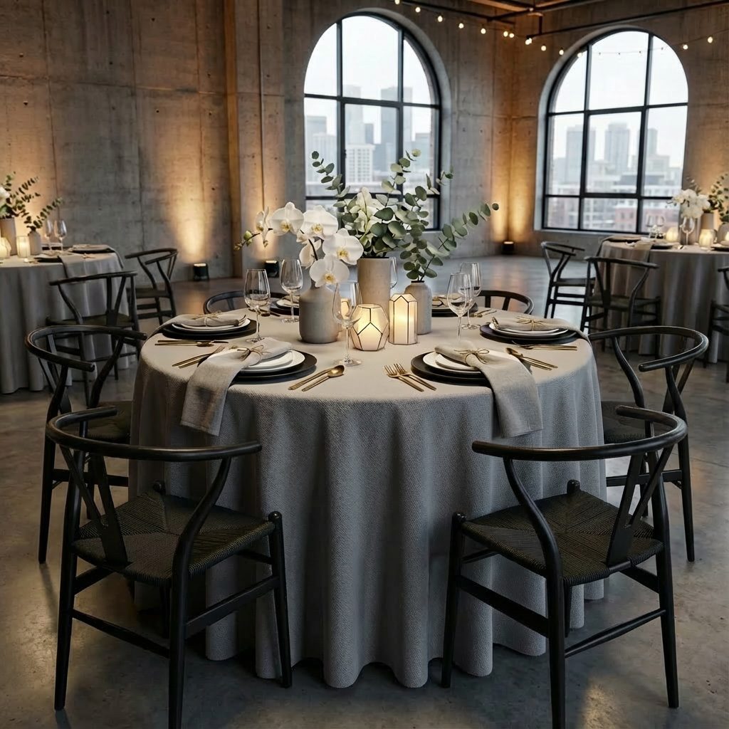 Trotz des widerstandsfähigen und pflegeleichten Polyesterstoffes sind diese Tischdecken durch ihre grobe Struktur nicht zu glänzend und damit ein echter Eyecatcher für jedes Dekoarrangement. Die vorhandenen Farbtöne, die zur Auswahl stehen, sind zeitlos und können flexibel in sämtlichen Konzepten eingesetzt werden – egal ob modern, rustikal oder klassisch. Mit diesen bodenlangen, runden Tischdecken, die Sie bei uns mieten können, kann nichts schiefgehen und Ihre Gäste werden begeistert sein. Auf die Verwendung eines Moltons unter der Tischdecke kann verzichtet werden, die passenden Tische können Sie auch bei uns mieten.