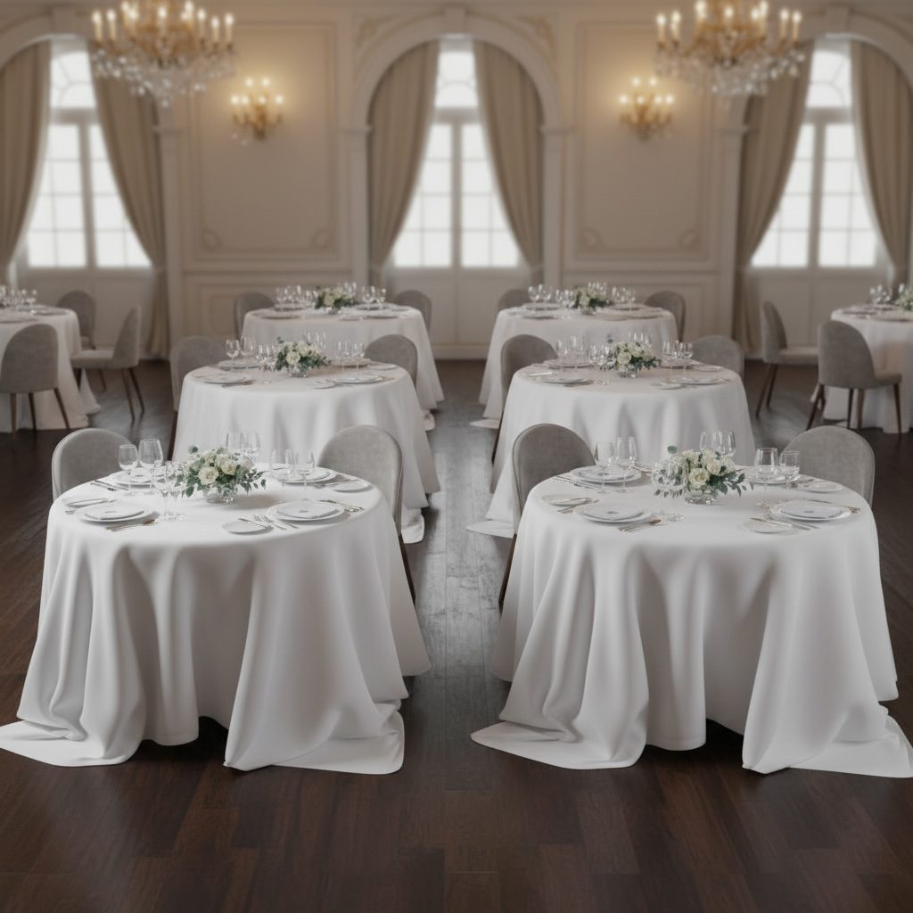 Diese Tischdecke mit einem Durchmesser von 330cm ist die perfekte Basis für jeden Dinner-Table. Dank des feinen Polyesterstoffs ist diese Tischdecke perfekt für elegante Setups geeignet. Egal ob für Hochzeiten oder Events – Unsere runde Tischdecke in weiß zu mieten sind für jeden Anlass die richtige Wahl.