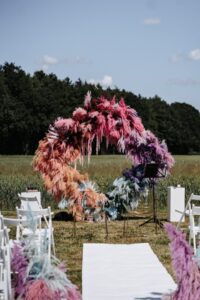 Das Highlight bei der Trauung war definitiv der Traubogen aus Pampasgras, der in allen Farben leuchtete. Floral Aesthetics aus Augsburg kümmerte sich um die gesamte Floristik. Neben dem buten Traubogen wurden unsere weißen Holzstühle für die Trauung eingesetzt.